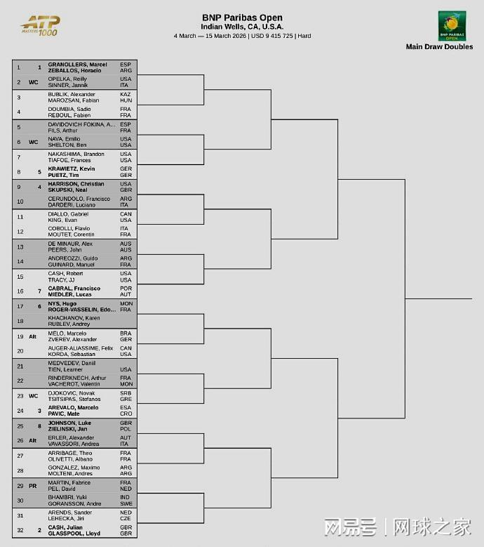 另外,北京时间今晨,ATP1000印第安维尔斯大师赛的双打签表出炉,多对组合堪称惊艳。比如,梅德维德夫搭档苦主勒纳-钱、辛纳联手美国小巨人奥佩尔卡、德约科维奇牵手西西帕斯……。